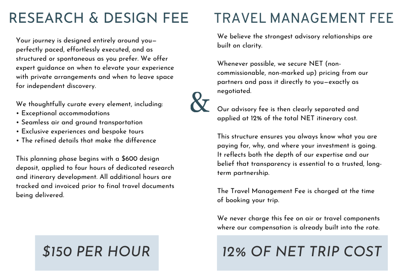 Rather than embedding commissions into your trip cost, we secure net pricing and are compensated directly for managing your travel. This structure allows us to act exclusively in your best interest—prioritizing value, flexibility, and protection over supplier incentives. The travel management fee is applied at the time of booking and supports our ongoing oversight before, during, and after your journey. We never charge the Travel Management Fee on air or travel components like hotels that already include commission.